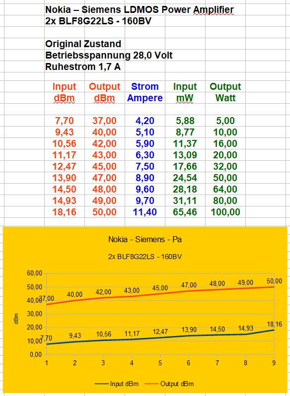 Die Ausgangsleistung wurde nur bis 100 Watt ermittelt, + 3dB sind, wenn die entstehende Wärme abgeführt werden kann, ohne Probleme möglich.